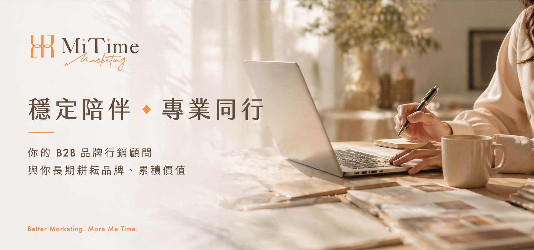 MiTime Marketing & Consulting 是一間專注 B2B 品牌行銷的顧問公司,從品牌定位、行銷策略規劃到落地執行,成為你身邊那個懂品牌、懂策略、也能捲起袖子一起做的夥伴。我們陪你把品牌的根扎穩,讓行銷不再是壓力,是你持續成長的底氣。